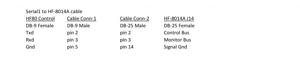 The System Controller uses serial communication with the HF-8014A to get Monitor Status information, specifically the current Mode and PA Status. The serial protocol used is the 8-bit HF-80 Word protocol (not the 7-bit ASCII protocol). The serial port configuration is 9600 baud, 8 data bits, odd parity and 1 stop bit. The HF-8014A serial card configuration switches must be set as follows: S1) Switch 2 closed, all others open. S2) All switches open. S3) Switch 5,6 closed, all others open. S4) Switch 5,6 closed, all others open. This Monitor Status information is used for LCD display purposes only and is not required for frequency control.