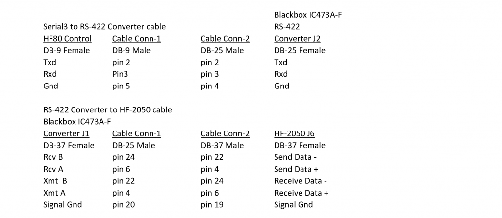 The following are required: 1) An RS-232 to RS-422 converter. 2) A DB-9 male to DB-25 male cable whose construction is described in the Serial Port cable document. 3) A DB-37 male to DB-37 male cable whose construction is described in the Serial Port cable document. The RS-232/RS-422 converter that I use is an old Black Box model IC456A-R3. If you use a different RS232/RS422 converter, then the cabling will probably be different. The DB-9 male connector plugs into the far-right DB-9 socket on the System Controller’s rear panel. 4) Setting the HF-2050 Remote Control port to the following settings: 9600 baud, odd parity, and 1 stop bit.